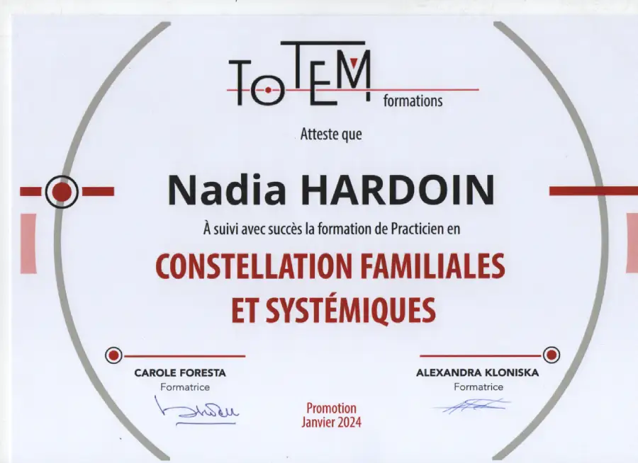 J’ai alors intégré une formation de thérapeute en constellations familiales chez TOTEM FORMATIONS auprès de Carole Foresta et Aleksandra Klosinska en septembre 2023. J’ai obtenu ma certification en janvier 2024.